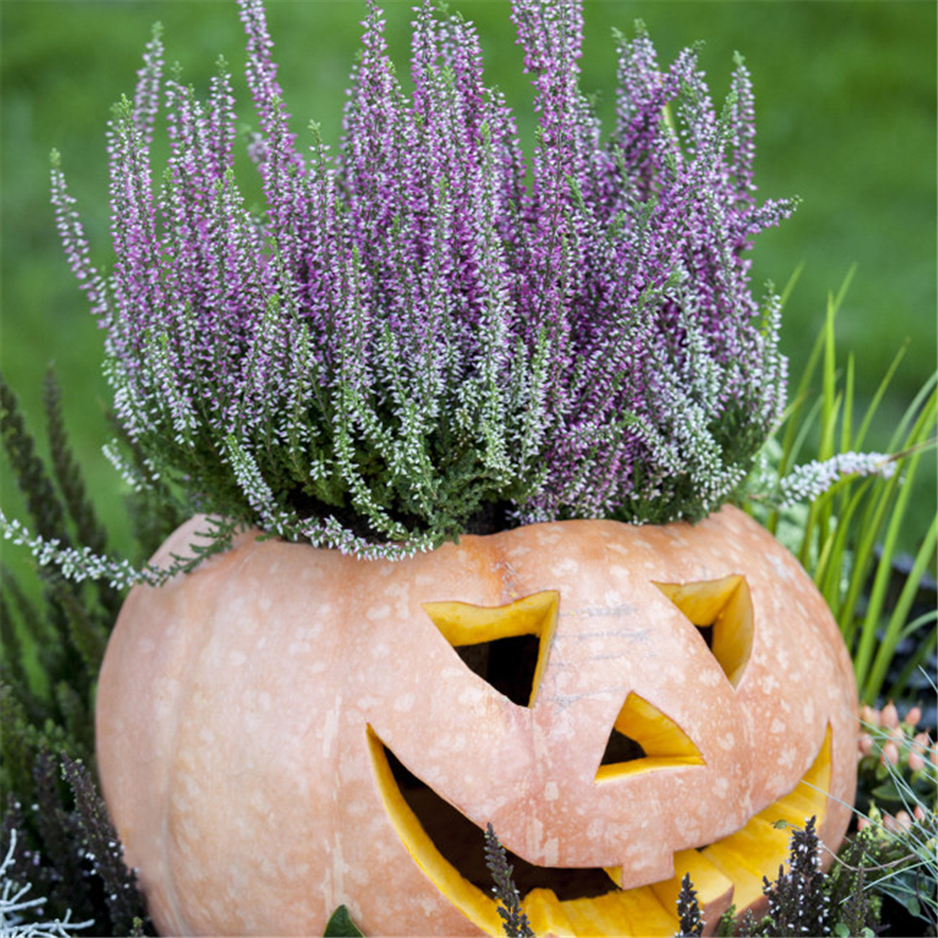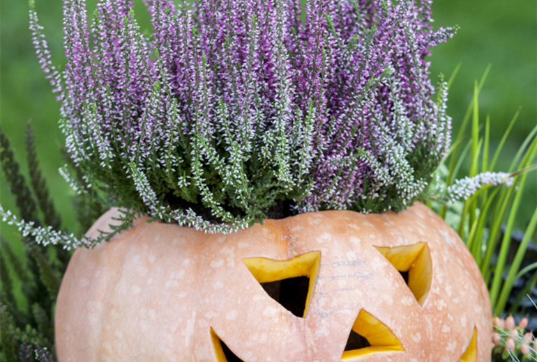 Am 31. Oktober ist wieder Halloween! Dafür können Kürbisse prima dekorativ bepflanzt oder als Laterne genutzt werden. Dafür einfach den Deckel von dem Kürbis abschneiden und den Kürbis (zum Beispiel mit einem Eisportionierer) aushöhlen. Das Fruchtfleisch kann später zu einer leckeren Suppe oder zu Kürbisspalten die im Ofen verarbeitet werden. Der ausgehöhlte Kürbis kann nun noch mit einem Gesicht versehen werden, dass mit einem scharfen Messer in die Seitenwand geschnitzt wird. Wer mag setzt den Deckel einfach wieder drauf und nutzt den Kürbis als Windlicht. Soll er bepflanzt werden, wird er nun mit Folie ausgekleidet und mit Blumenerde befüllt. Danach kann er mit Heidekraut, Alpenveilchen oder anderen Pflanzen bepflanzt werden. Tipp: Der bepflanzte Kürbis sollte vor Regen geschützt, zum Beispiel unter einem Vordach oder am Hauseingang, stehen, damit er nicht matschig wird.
