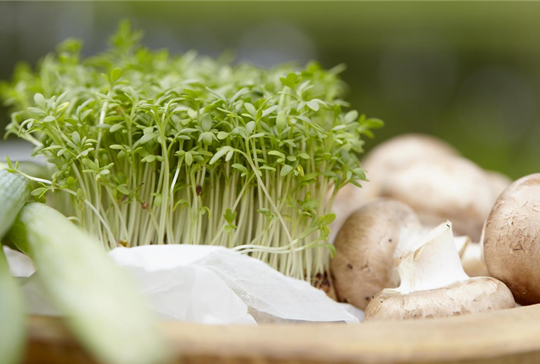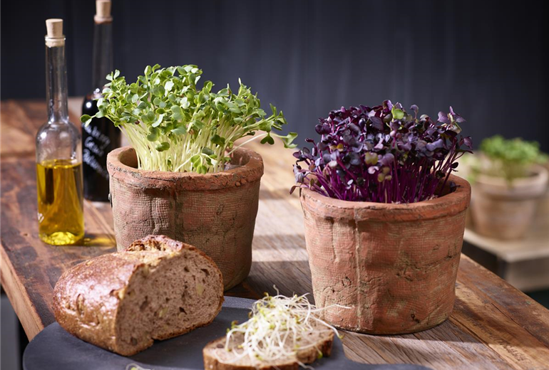 Grünsprossen, auch Microgreens genannt, sind momentan der Trend in Sachen Superfood! Kein Wunder, sie bringen viel Geschmack und Vitamine auf den Teller. Im Gegensatz zu Keimsprossen, die komplett gegessen werden, werden die Mini-Keimlinge über den Wurzeln abgeschnitten. Zudem werden sie in Anzuchterde ausgesät. Saatgut von beispielsweise Radieschen, Senf, Koriander oder Salatrauke wird dafür dicht an dicht in einen mit Anzuchterde gefüllten Blumentopf oder Schale gefüllt. Das Saatgut vorsichtig andrücken und regelmäßig mit Wasser ansprühen. Für ein gleichmäßiges Klima wird Frischhaltefolie über das Gefäß gespannt, damit sich kein Schimmel bildet muss diese einmal am Tag entfernt werden. Schalen können auch mit feuchtem Zeitungspapier abgedeckt werden, sobald die Keimlinge das Papier hochdrücken, wird es abgenommen. An einem hellen und warmen Standort ohne direkte Sonneneinstrahlung kann anhängig von der Keimzeit der Sorte schon nach gut einer Woche mit der Ernte der herrlich würzig schmeckenden Grünsprossen begonnen werden.